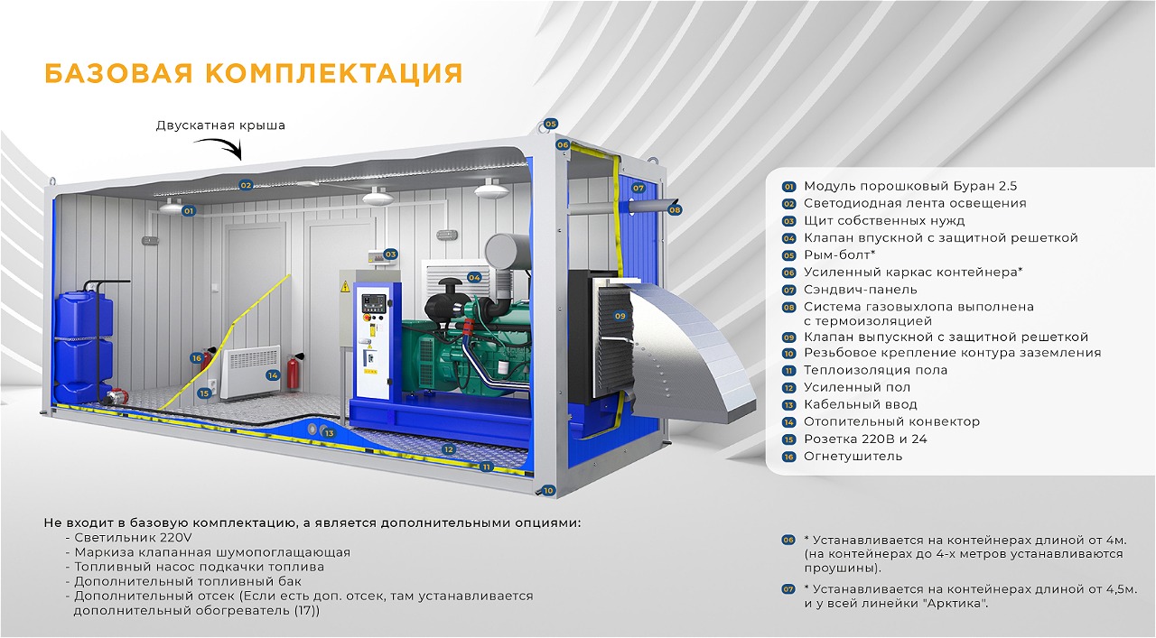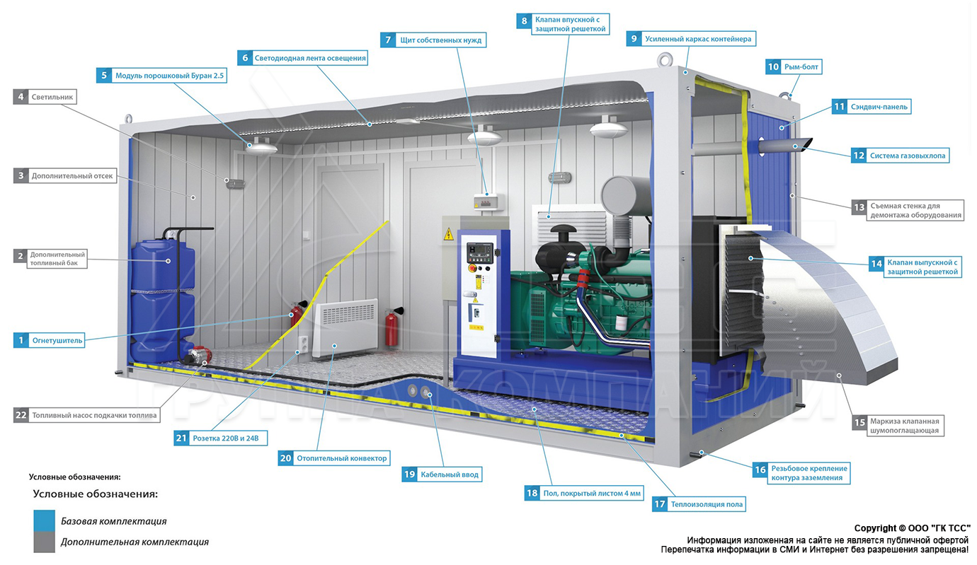 Блок-контейнеры ТСС позволяют не только обеспечить защиту установленных ГЕНЕРАТОРОВ от внешних условий, в действительности, они значительно расширяют функционал размещённого оборудования, увеличивая его возможности по автономной эксплуатации. Базовые варианты комплектации контейнеров ТСС уже включают в себя наборы дополнительного оборудования и защитных систем, но, по желанию заказчика, набор дополнительного оборудования может быть значительно расширен.