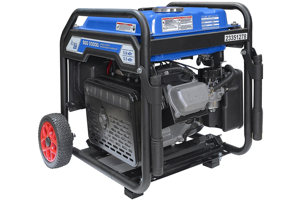 Бензогенератор инверторный SGG 5000Ei с электростартом, коннектором для подключения АВР, укомплектован колесным комплектом для удобства перемещения.